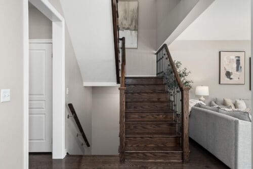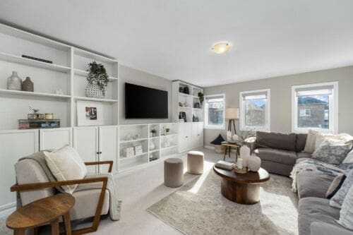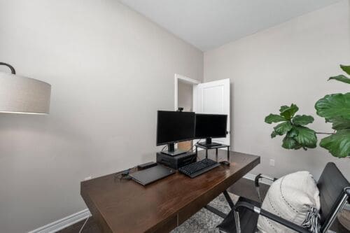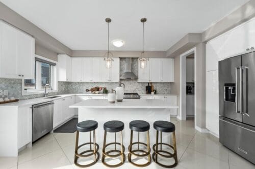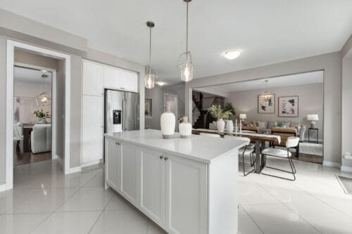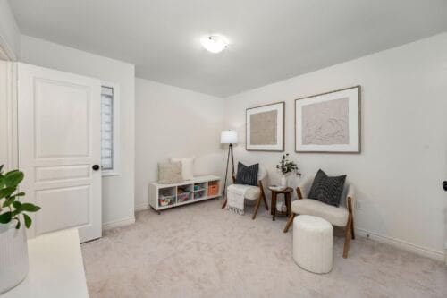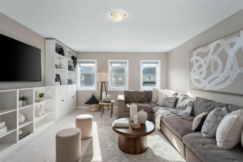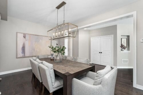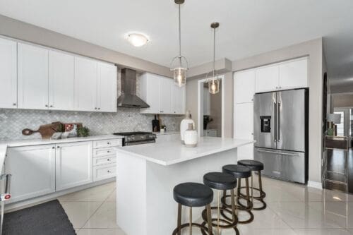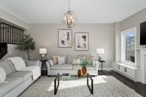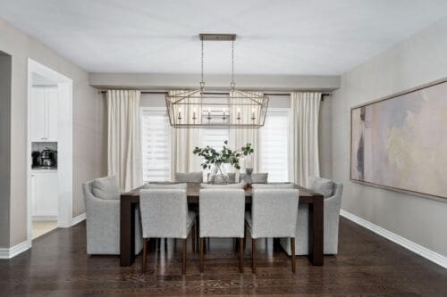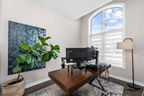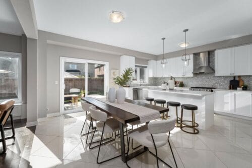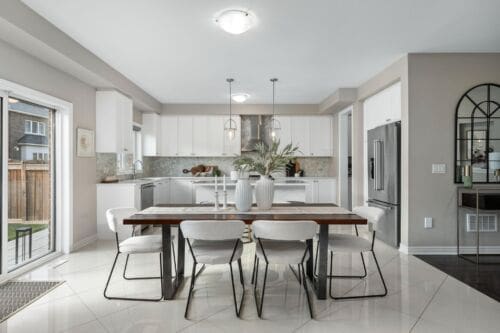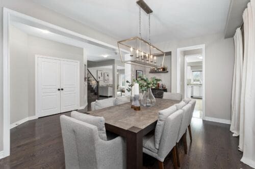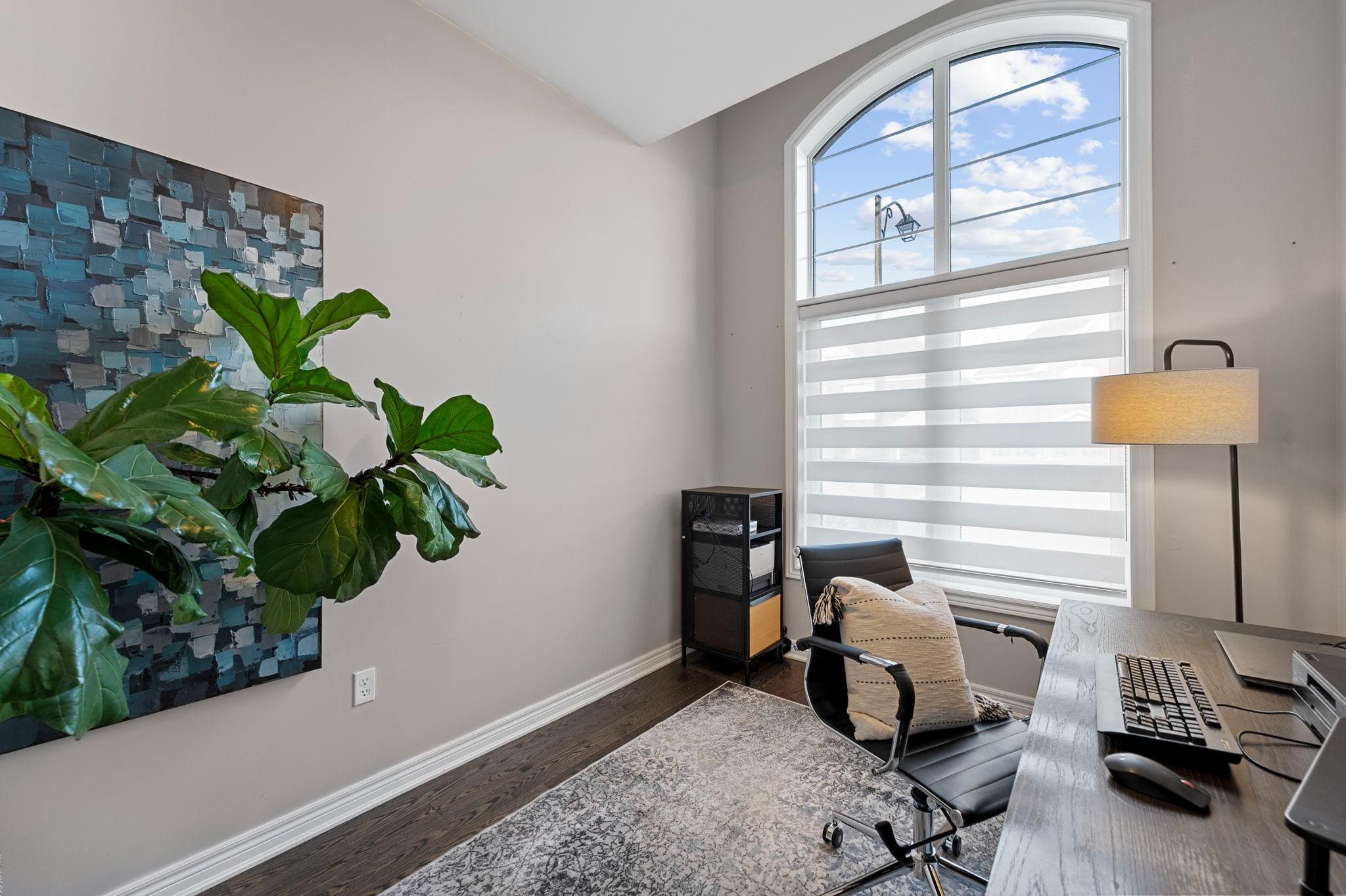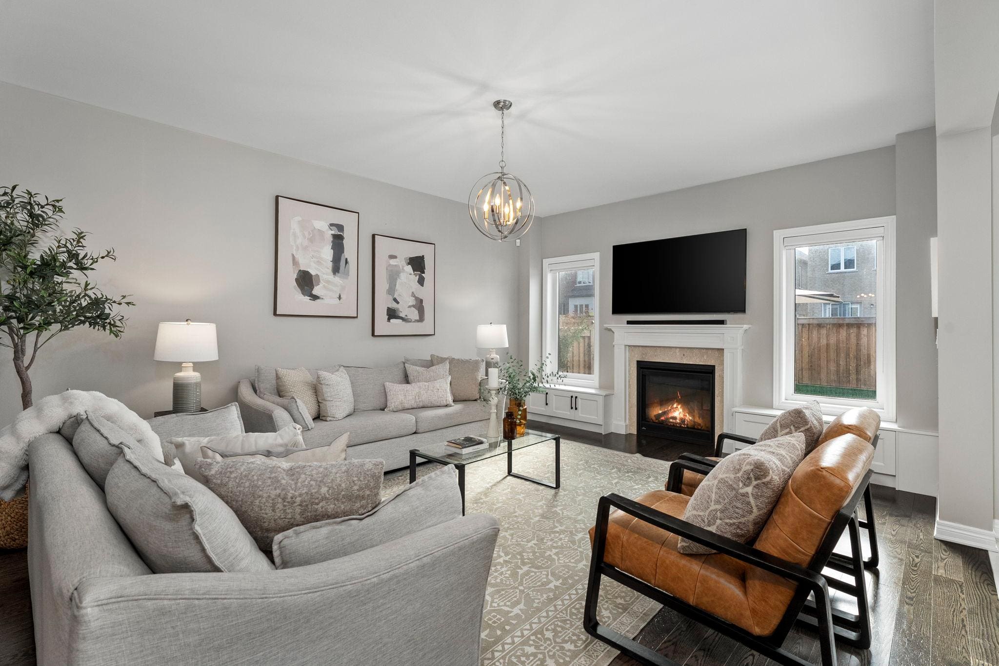The main floor features a bright home office, a modern kitchen with a breakfast nook, and a spacious living room centered around a cozy gas fireplace. A convenient servery connects the formal dining room to the kitchen, making entertaining effortless and elegant. Large windows fill the home with natural light, creating a warm and inviting atmosphere throughout.