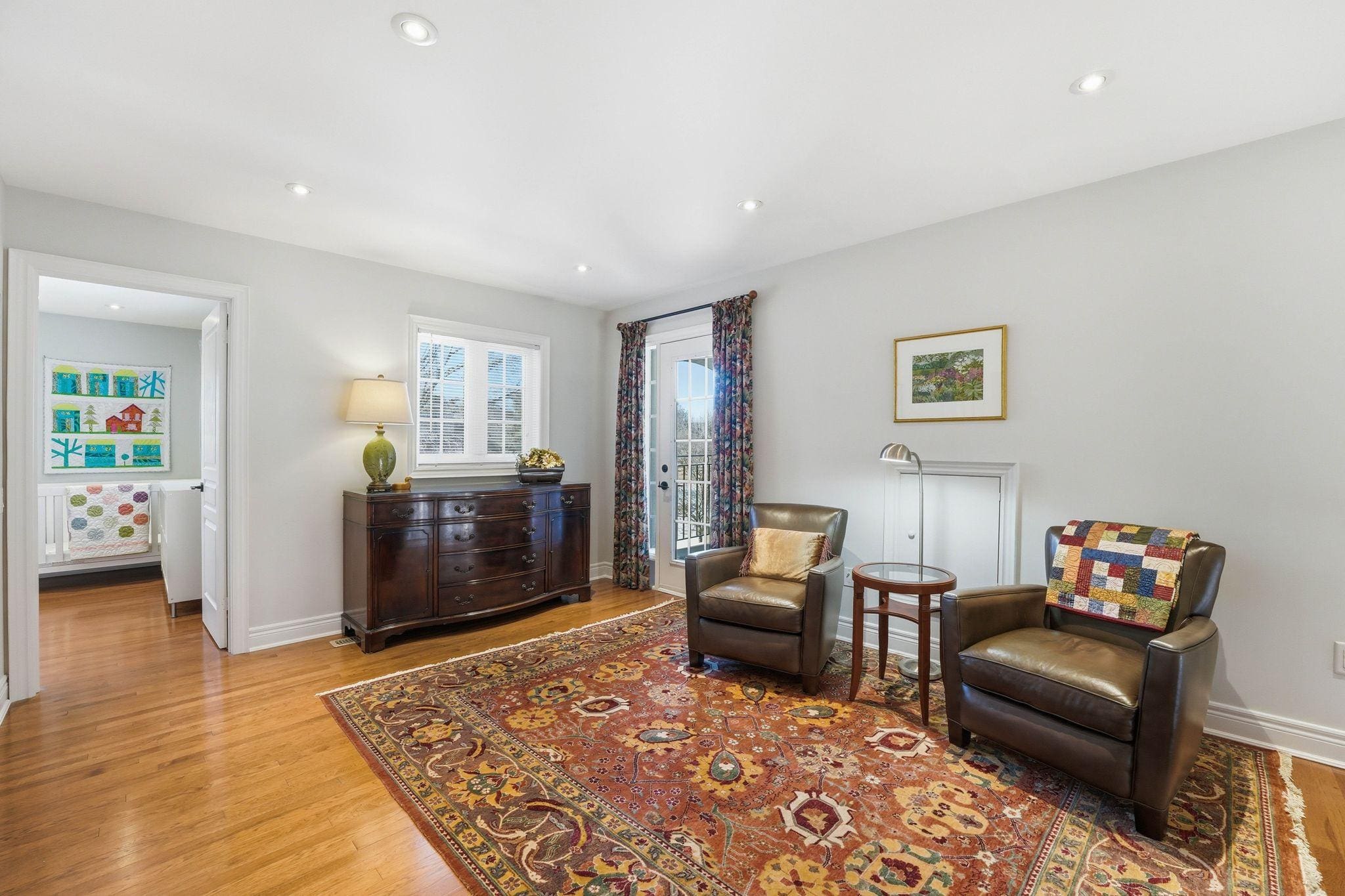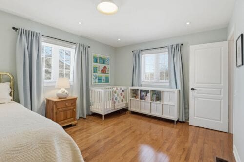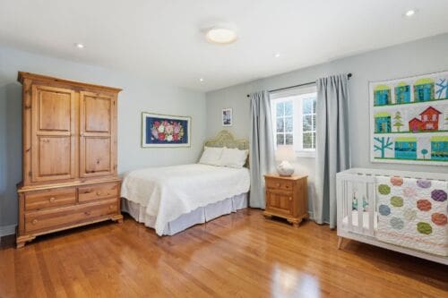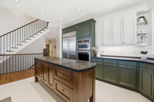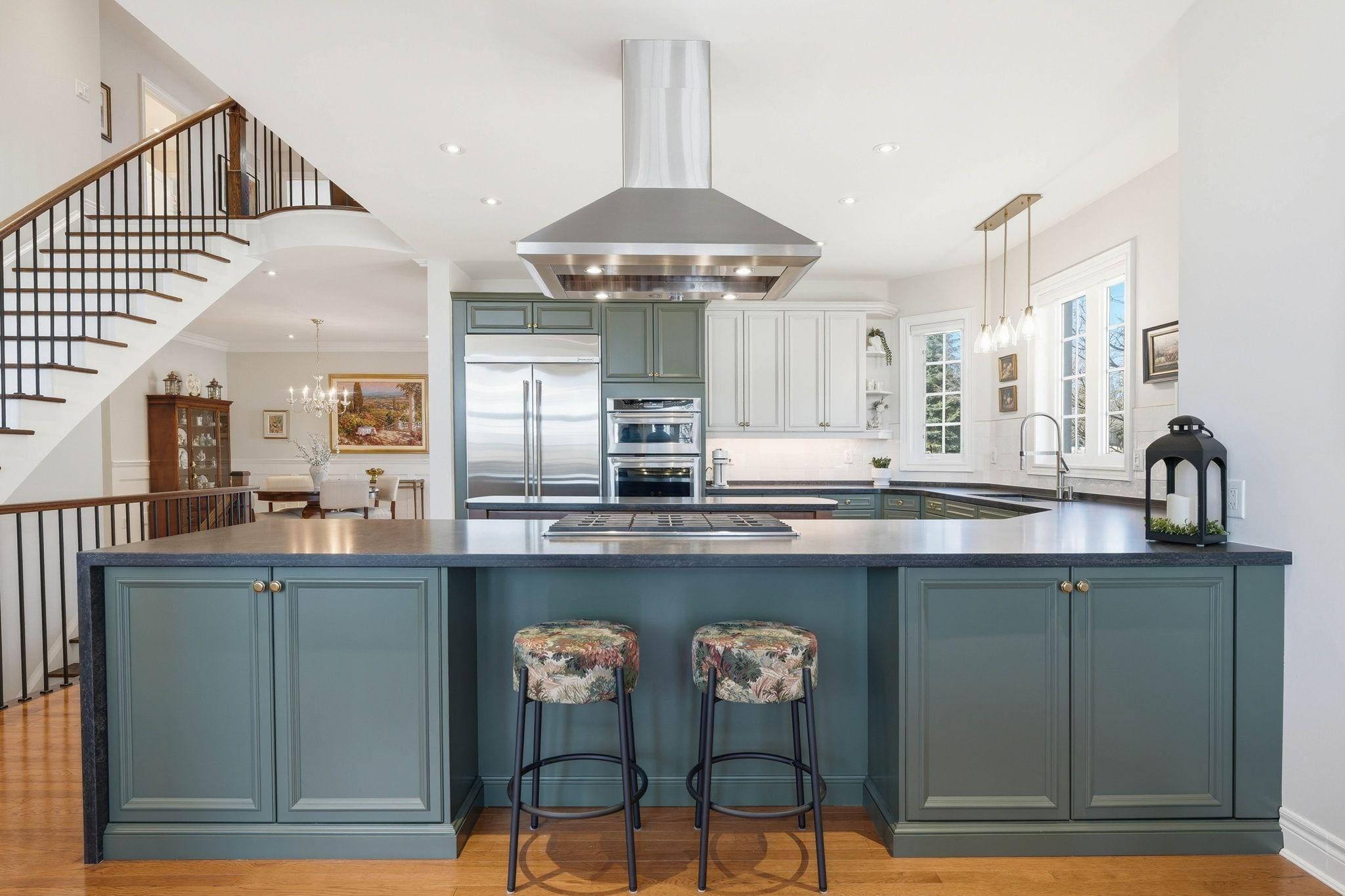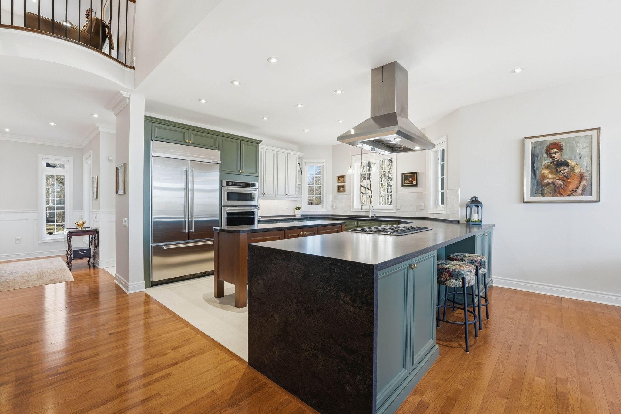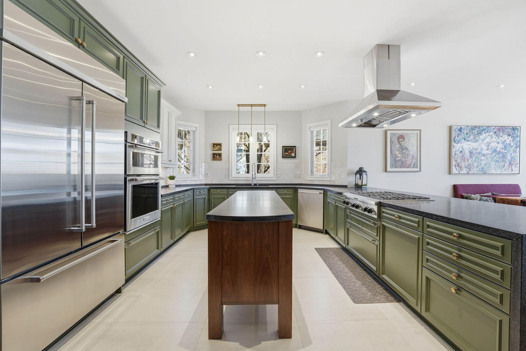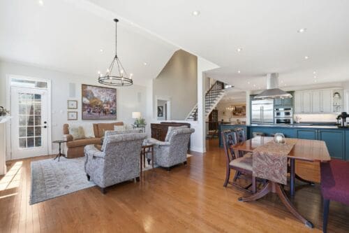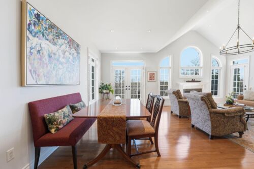 The kitchen is both stylish and functional, complete with Caesarstone countertops, solid brass hardware, a centre island, and a full suite of KitchenAid appliances. Two dining areas provide flexibility for both cozy dinner parties and larger family gatherings, while the breakfast area walks out to the upper deck for seamless indoor-outdoor flow.