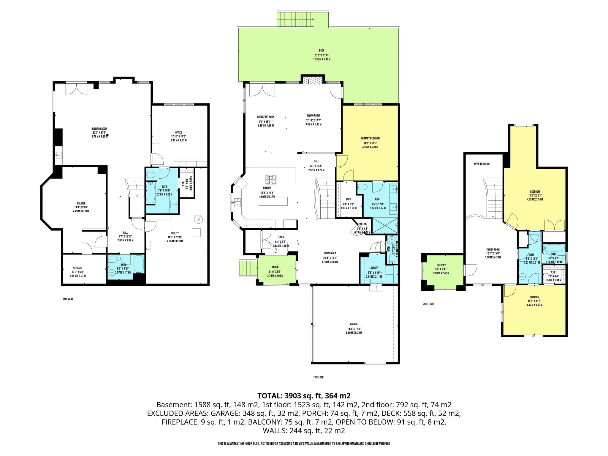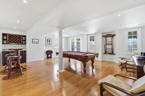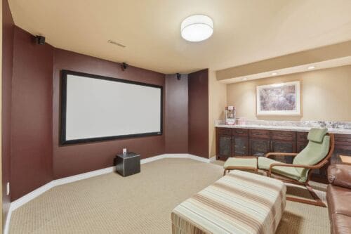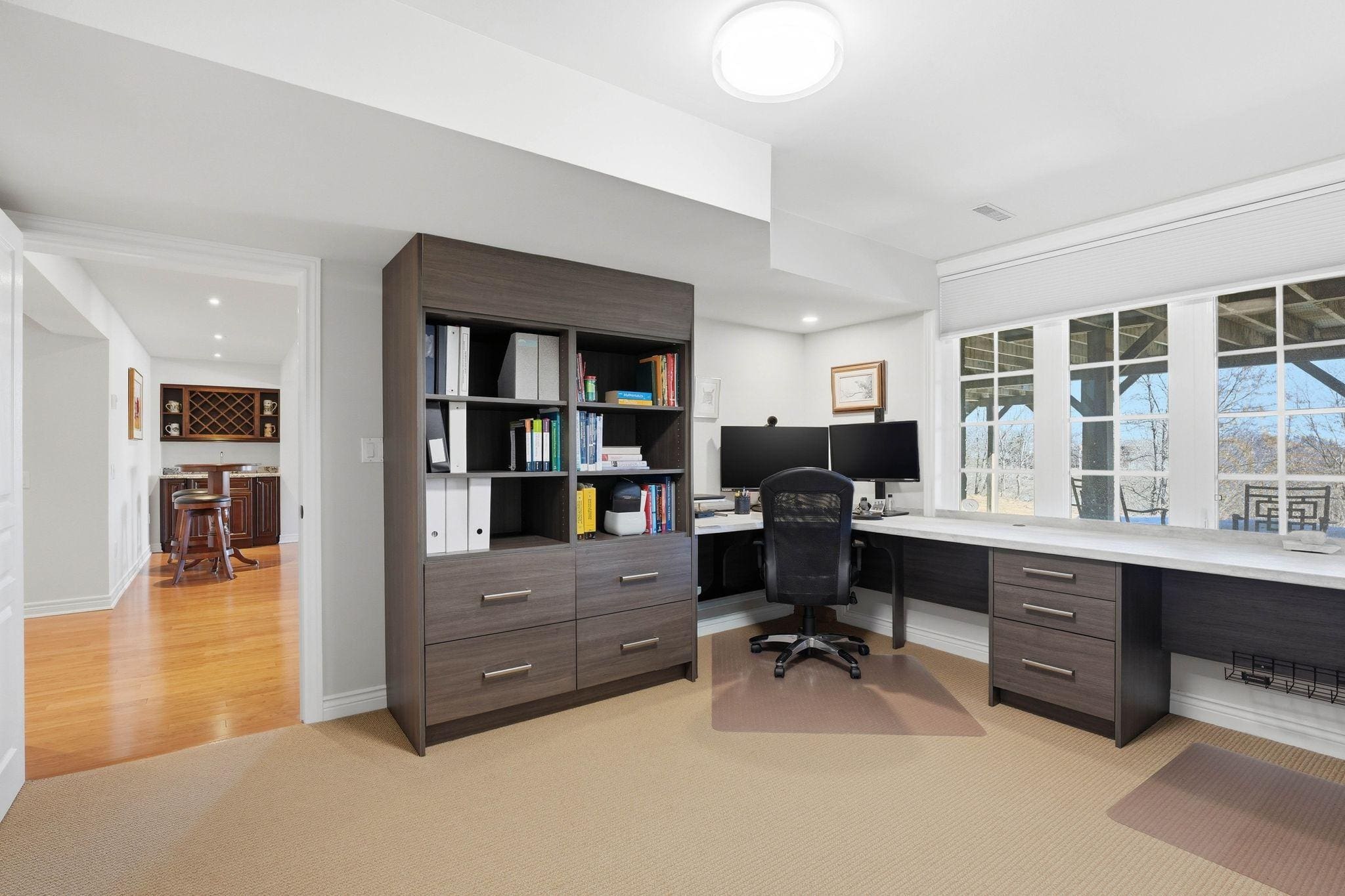 The fully finished walk-out basement expands the living space with a theatre room, a billiards area with wet bar, and a private guest or office suite with a Murphy bed, walk-in closet, and ensuite.